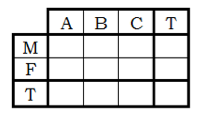 The Double Matrix Method is used for sets in which there are two variables, each of which has two or more categories. For example, suppose in some group (a company, a school, etc.), one variable is general (male & female), and the other variable can be anything (A & B & C). Then we set up a "matrix:"